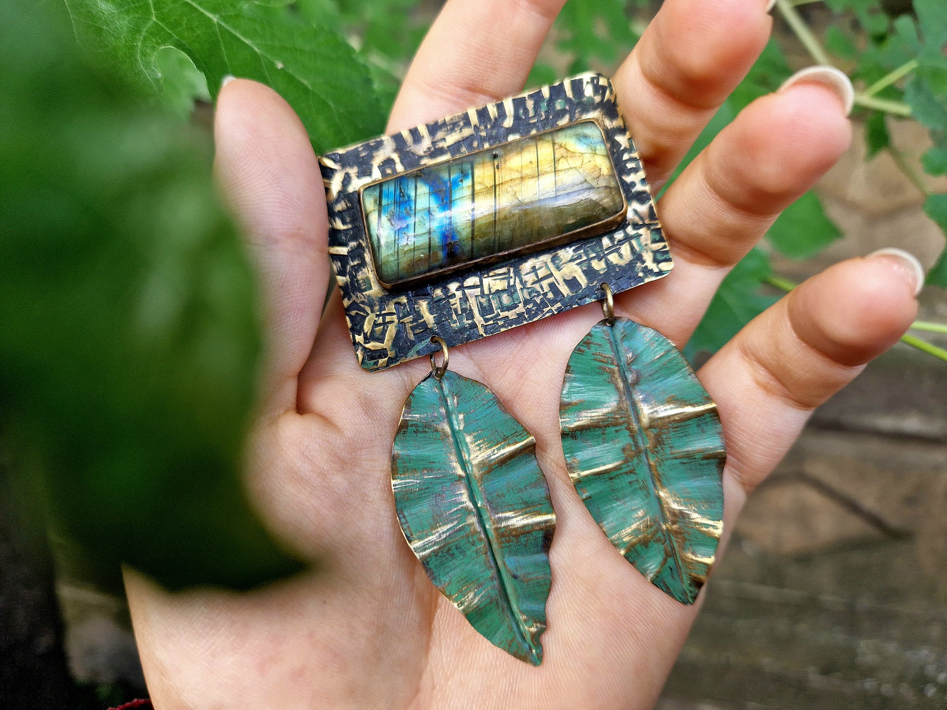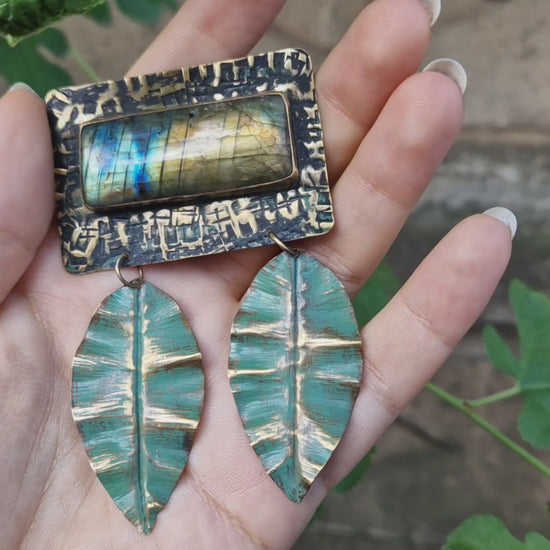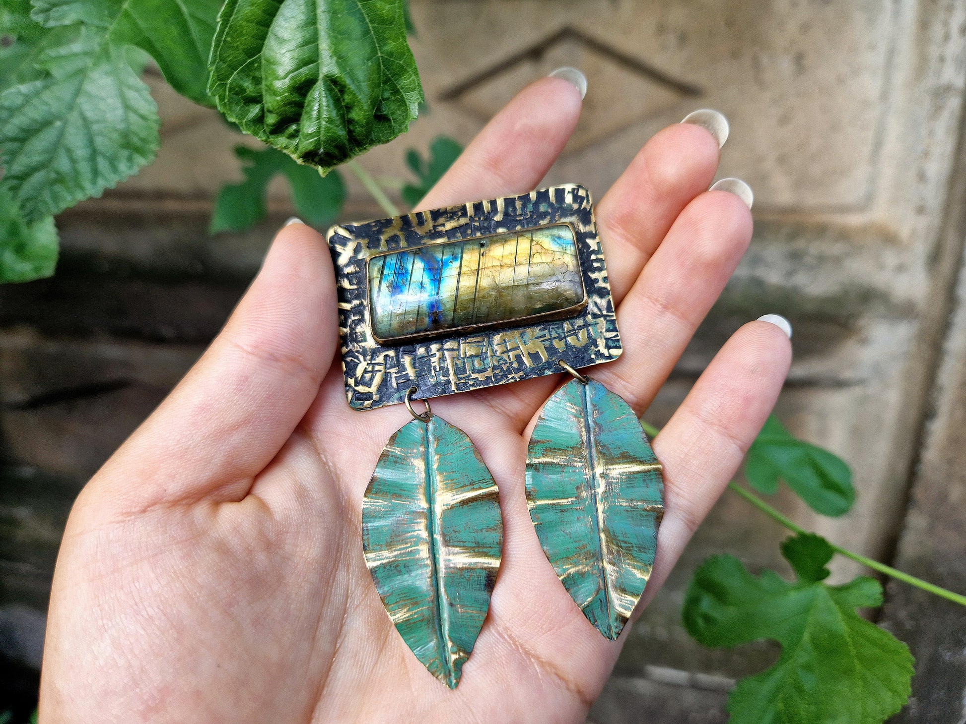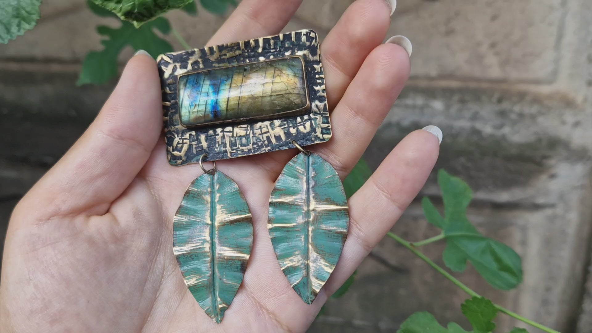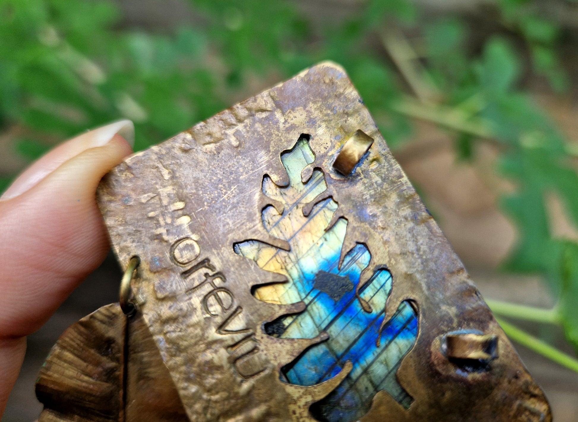 🌿 un pandantiv unicat, lucrat în tehnică mixtă, cu un labradorit policrom în tăietură rectangulară (e spectrolit, lucind în nuanțe diverse, iar focurile sunt mult mai intense în realitate), textură artizanală și oxidare intenționată, două frunze confecționate din alamă, patinate și ele artizanal